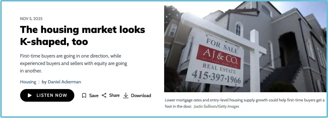 New data seems to lend support to the idea that the economy is going in opposite directions at the same time, depending on where you sit in it. Wednesday’s K-shape reference is brought to you by the housing sector, where first-time homebuyers are having a rougher go than those who’ve been to this particular rodeo before.
